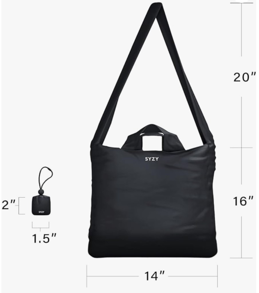 It packs down so tiny and carries SO much. I like that it’s messenger bag style and that it has a built in loop that twist-snaps shut so you can attach it to your day bag.