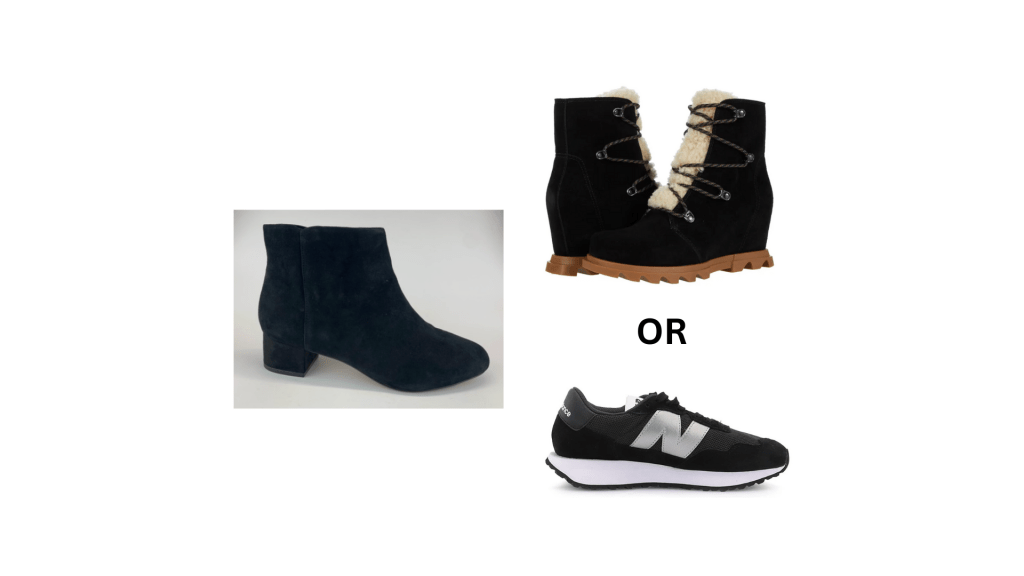 - 1x Pair of stylish yet functional sneakers OR snow boots (depending on weather)